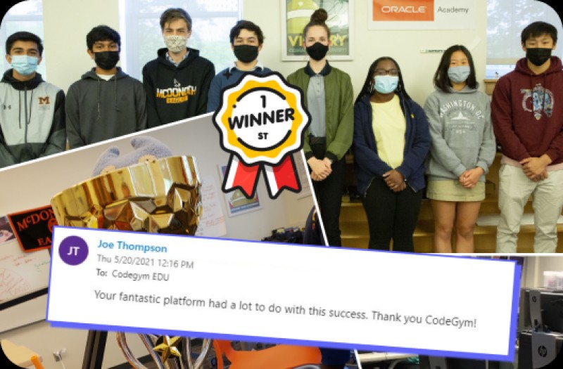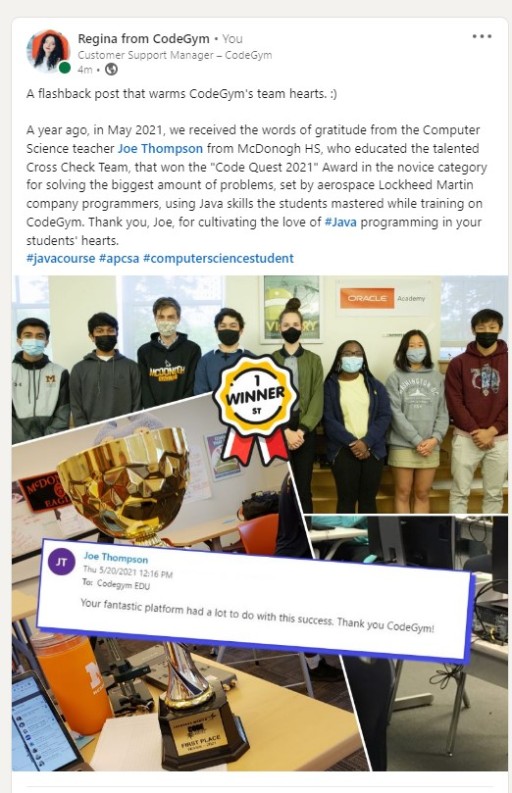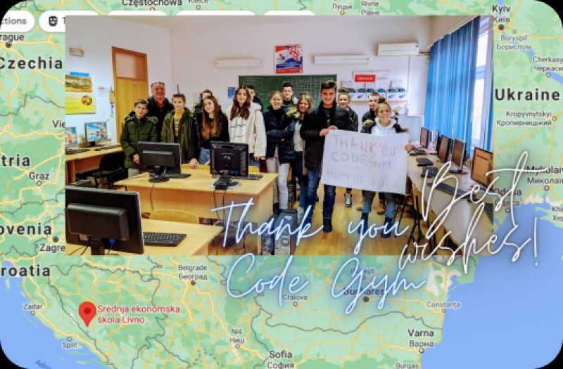 Məsələn, Xorvatiyadan məktəblilərdən təşəkkür fotoları. Və ya ABŞ-dakı tələbələrin mükafatları, ABŞ-dan robototexnika yarışmasının iştirakçıları, McDonough School məktəblilərinin şəkilləri, onlar CodeGym-i keçdikdən sonra Java üzrə Lockheed Martin yarışmasında 1-ci yeri tutublar. Hindistanlıların şəkilləri, onlar offline proqramlaşdırma dərslərimizə gəlmiş və sonra online kursu keçmişlər.