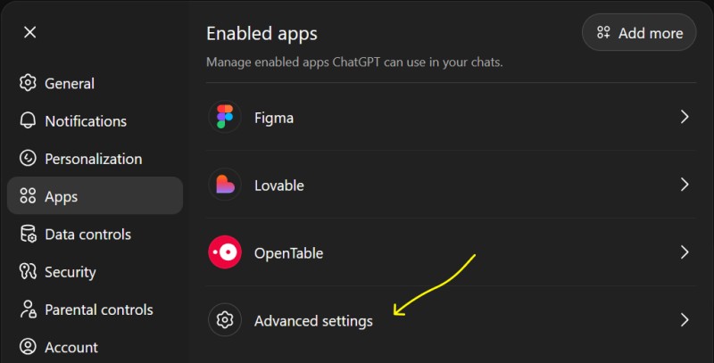 - Suivez le lien https://chatgpt.com/#settings/Connectors/Advanced ou allez dans