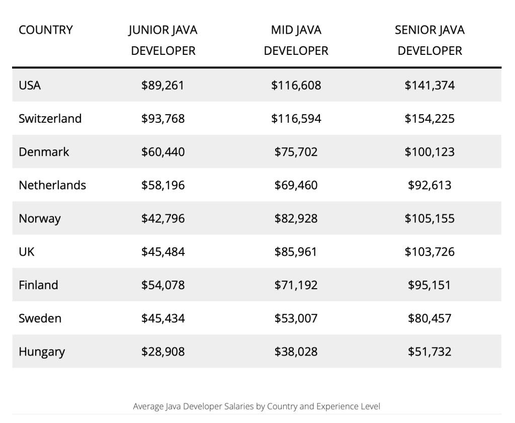 Si vous avez déjà fondé une famille et des enfants, il est possible que vous souhaitiez une vie tranquille et aisée dans un pays à l’économie stable. Vous envisagez un déménagement/une immigration au Canada, aux États-Unis, en Suisse ou même en Australie. Vous avez d’excellentes compétences et un métier recherché. Vous n’aurez pas à commencer comme plongeur. Mais, par exemple, comme Senior Java Developer. Et probablement avec un salaire plus élevé. Pas mal, non ?