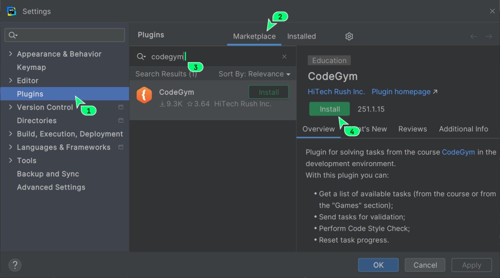 Pluginsnel menu laterale e apri la schedaMarketplace. Nella barra di ricerca, digita codegym![]()