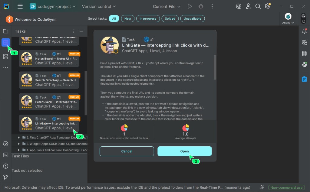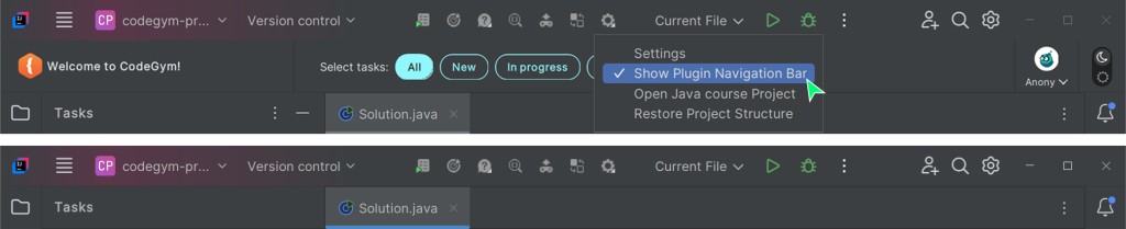 Il plugin si integra nell'ambiente di sviluppo Intellij IDEA, WebStorm o PyCharm e altri IDE Jetbrains, permettendoti di lavorare sui compiti del corso CodeGym al suo interno. Ad esempio, scrivere il codice della soluzione, inviarlo per la verifica, controllare la tua soluzione rispetto a quella "predefinita" e molto altro. I progressi nella risoluzione dei compiti nel plugin sono sincronizzati con il tuo account CodeGym, quindi appariranno identici sia sul sito web che nell'ambiente di sviluppo.