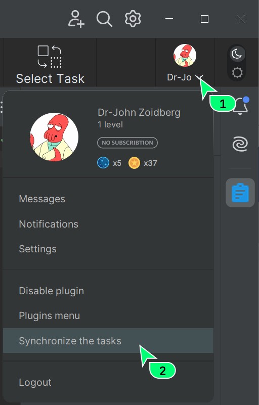 Pertanto, se hai risolto un compito sul sito web, sarà presente anche nell'elenco dei compiti risolti nel plugin. Se hai bisogno di aggiornare le informazioni sullo stato del compito in questo momento, clicca sul tuo avatar (in alto a destra) e nel menu a discesa seleziona Synchronize tasks: