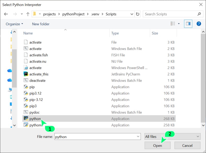 Twój_projekt->.venv->Scripts(dla Windows) lubbin(dla macOS/Linux). - Wewnątrz tego folderu wybierz plik