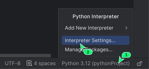 - Ponownie klikamy na wersję Python w prawym dolnym rogu i wybieramy punkt Interpreter Settings.
