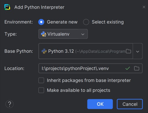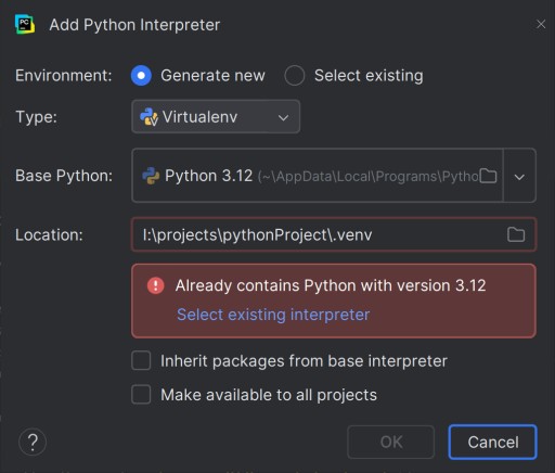 Jeśli wejdziesz w menu dodawania interpretera i wybierzesz Generate new, PyCharm może wyświetlić czerwone ostrzeżenie i zablokować przycisk OK. Dzieje się tak, ponieważ edytor z przyzwyczajenia próbuje utworzyć nowe środowisko w tym samym folderze .venv, który jest już zajęty przez twoje pierwsze środowisko. Dwa różne zestawy bibliotek nie mogą żyć w jednym folderze.