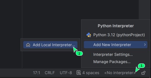 - Kliknij na wersję Python w rogu i wybierz Add New Interpreter -> Add Local Interpreter.