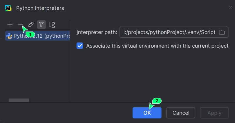 - Zobaczysz listę wszystkich środowisk, o których wie PyCharm. Zaznacz to, które chcesz usunąć, i kliknij przycisk z minusem w menu nad listą.