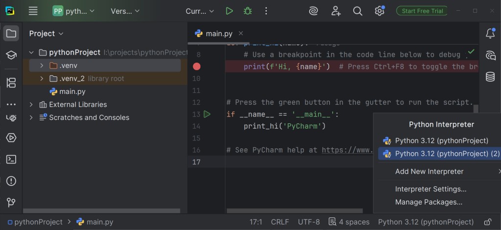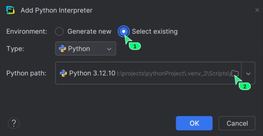 Często zdarza się, że utworzyłeś drugie środowisko, a pierwsze zniknęło z menu, chociaż folder .venv wciąż leży w projekcie. W tym przypadku trzeba po prostu wskazać PyCharm, gdzie szukać starego Pythona. Przykład przełączenia z .venv_2 na .venv:
