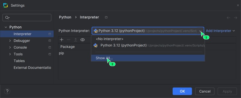- Na górze szukamy pola Python Interpreter. Rozwijamy listę i wybieramy punkt Show All.