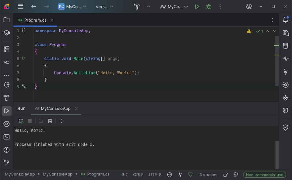 Once Rider creates your project, we'll write some code using the classic C# program structure. Don't freak out about new words like namespace, class, and Main—these are the standard "building blocks" of any console app.