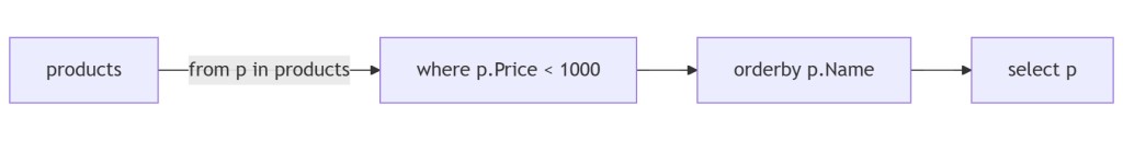 Here, it reads just like a classic query: "from the products collection take p, where p.Price < 1000, order by p.Name, select p".