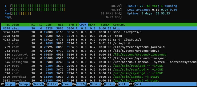 如果你覺得 top 太「原始」,歡迎使用 htop。這是一個用於監控進程的視覺化介面。它是彩色的,支援滑鼠操作,而且容易理解。