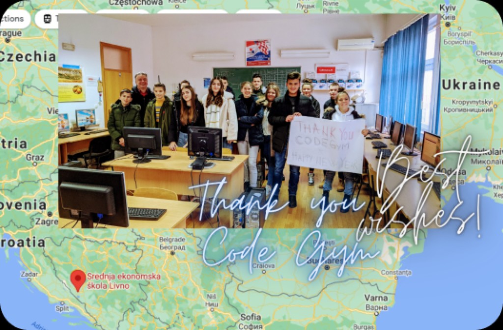 Ví dụ, các hình ảnh cảm ơn từ học sinh Croatia. Hoặc giải thưởng của sinh viên đại học Mỹ, những người tham gia hào hứng của cuộc thi robot từ Mỹ, ảnh của học sinh trường McDonough, những người sau khi hoàn thành khóa CodeGym đã đoạt giải nhất về Java tại cuộc thi Lockheed Martin, những bức ảnh của người Ấn Độ, những người đã đến các bài giảng offline của chúng tôi về lập trình, và sau đó tham gia khóa học online.