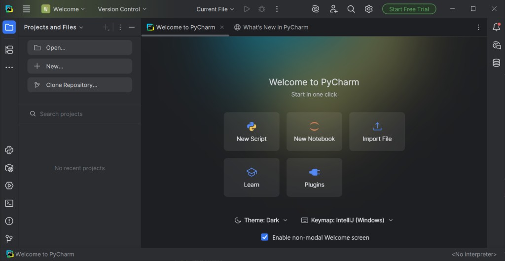 首次启动时,你可以启用 Pro 模式的试用月。试用结束后,PyCharm 会建议购买订阅或保留在免费版本。对于我们的课程,你不需要购买任何东西 — 基本工具绰绰有余。