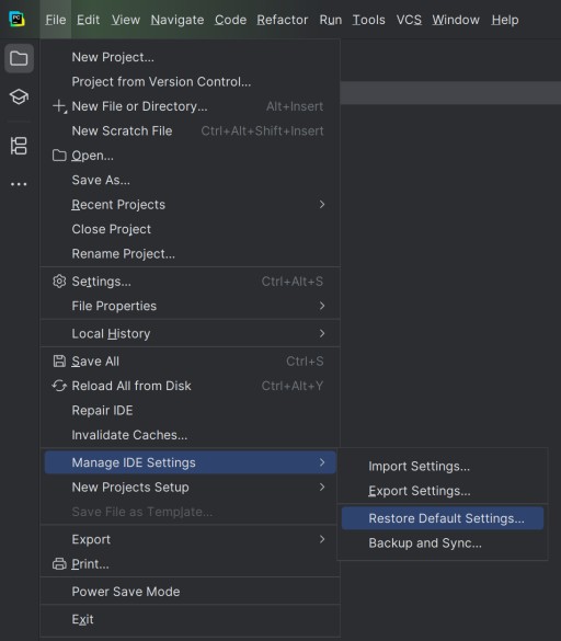 转到 File 菜单,选择 Manage IDE Settings 并点击 Restore Default Settings。程序将重新启动并变得像第一天一样干净。这是修复配置中任何错误的最快方法。