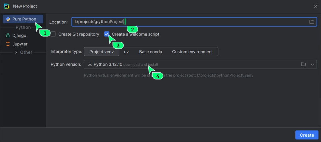 - Python version — 确保这里选择了版本 3.12 或 3.13。如果未选择,请打开下拉列表。如果计算机上没有,PyCharm 可以自行下载并安装所需的 Python 版本。
